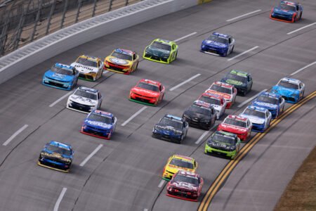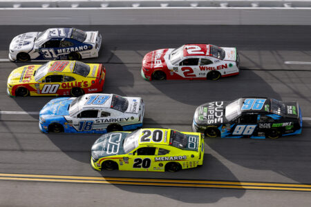 TALLADEGA, ALABAMA – APRIL 25: Blaine Perkins, driver of the #31 MEZRANO Alabama Injury Lawyers Chevrolet, Sheldon Creed, driver of the #00 Ollie’s Chevrolet, William Sawalich, driver of the #18 Starkey Toyota, Brandon Jones, driver of the #20 Menards/Charbroil Toyota, Jesse Love, driver of the #2 Whelen Chevrolet, and Anthony Alfredo, driver of the #96 Dude Wipes mentHOLE Chevrolet, race during the NASCAR O’Reilly Auto Parts Series Ag-Pro 300 at Talladega Superspeedway on April 25, 2026 in Talladega, Alabama. (Photo by Sean Gardner/Getty Images)
