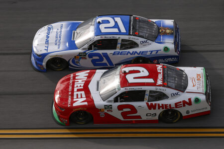 TALLADEGA, ALABAMA – APRIL 25: Austin Hill, driver of the #21 Bennett Transportation Chevrolet, and Jesse Love, driver of the #2 Whelen Chevrolet, race during the NASCAR O’Reilly Auto Parts Series Ag-Pro 300 at Talladega Superspeedway on April 25, 2026 in Talladega, Alabama. (Photo by Sean Gardner/Getty Images)