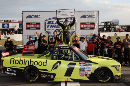 Starting from 7th place Truck 1 Corey Heim Robinhood Toyota won the Black’s Tire 200, his 25th win in 92 NASCAR CRAFTSMAN Truck Series races. This is his 2nd win & 3rd Top 10 finish in 2026. This is his 1st win & 2nd Top 10 finish in 2 races at Rockingham Speedway. 2nd Place Truck 11 Kaden Honeycutt Safelite Toyota, started from 3rd place posted his 2nd Top 10 finish in 2 races at Rockingham Speedway. It is his 4th Top 10 finish in 2026. 3rd Place Truck 34 Layne Riggs BKB Bare Knuckle Boxing Ford, started from 5th place posted his 1st Top 10 finish in 2 races at Rockingham Speedway.