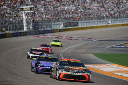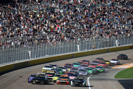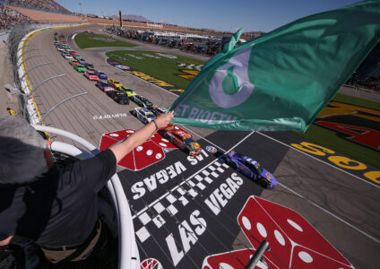Credit: LAS VEGAS, NEVADA – OCTOBER 12: Denny Hamlin, driver of the #11 ampm Toyota, leads the field to the green flag to start the NASCAR Cup Series South Point 400 at Las Vegas Motor Speedway on October 12, 2025 in Las Vegas, Nevada. (Photo by Chris Graythen/Getty Images)