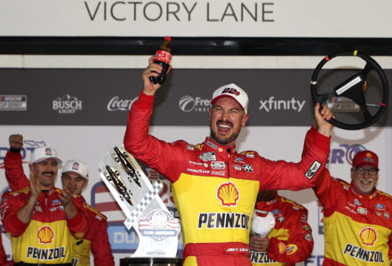 Credit: DAYTONA BEACH, FLORIDA – FEBRUARY 12: Joey Logano, driver of the #22 Shell Pennzoil Ford, celebrates in victory lane after winning Duel 1 for the NASCAR Cup Series Daytona 500 at Daytona at Daytona International Speedway on February 12, 2026 in Daytona Beach, Florida. (Photo by James Gilbert/Getty Images)