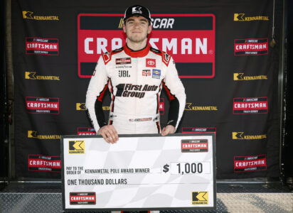 Credit: TALLADEGA, ALABAMA – OCTOBER 17: Giovanni Ruggiero, driver of the #17 First Auto Group Toyota, poses with the pole award winner $2100.00 check during qualifying for the NASCAR Craftsman Truck Series Love’s RV Stop 225 at Talladega Superspeedway on October 17, 2025 in Talladega, Alabama. (Photo by Sean Gardner/Getty Images)