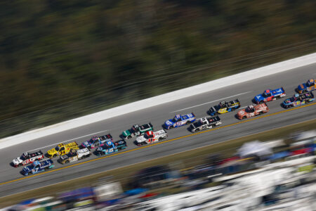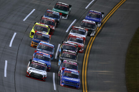 Credit: TALLADEGA, ALABAMA – OCTOBER 17: Giovanni Ruggiero, driver of the #17 First Auto Group Toyota, leads the field to the green flag to start the NASCAR Craftsman Truck Series Love’s RV Stop 225 at Talladega Superspeedway on October 17, 2025 in Talladega, Alabama. (Photo by Sean Gardner/Getty Images)