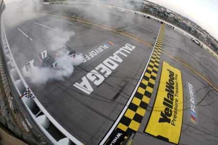 Credit: TALLADEGA, ALABAMA – OCTOBER 17: Giovanni Ruggiero, driver of the #17 First Auto Group Toyota, celebrates with a burnout after winning the NASCAR Craftsman Truck Series Love’s RV Stop 225 at Talladega Superspeedway on October 17, 2025 in Talladega, Alabama. (Photo by Sean Gardner/Getty Images)