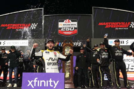 Credit: MARTINSVILLE, VIRGINIA – OCTOBER 25: Taylor Gray, driver of the #54 Operation 300 Toyota, takes the checkered flag to win the NASCAR Xfinity Series IAA and Ritchie Bros. 250 at Martinsville Speedway on October 25, 2025 in Martinsville, Virginia. (Photo by Jared C. Tilton/Getty Images)