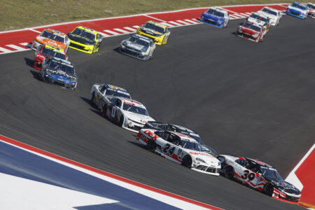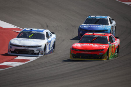 Credit: AUSTIN, TEXAS – FEBRUARY 28: Justin Allgaier, driver of the #7 BRANDT Chevrolet, Austin Hill, driver of the #21 Bennett Transportation Chevrolet, and Carson Kvapil, driver of the #91 Clarience Technologies Chevrolet, race during the NASCAR O’Reilly Auto Parts Series Focused Health 250 at Circuit of The Americas on February 28, 2026 in Austin, Texas. (Photo by James Gilbert/Getty Images)