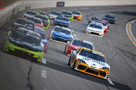 Credit: HAMPTON, GEORGIA – FEBRUARY 21: Austin Hill, driver of the #21 Bennett Transportation Chevrolet, Carson Kvapil, driver of the #1 Arby’s Chevrolet, Corey Day, driver of the #17 HendrickCars.com Chevrolet, Justin Allgaier, driver of the #7 Registix Chevrolet, Sheldon Creed, driver of the #00 Road Ranger Chevrolet, and William Sawalich, driver of the #18 Soundgear Toyota, race during the NASCAR O’Reilly Auto Parts Series Bennett Transportation & Logistics 250 at Echo Park Speedway on February 21, 2026 in Hampton, Georgia. (Photo by Sean Gardner/Getty Images)