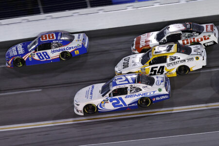 Credit: HAMPTON, GEORGIA – FEBRUARY 21: Rajah Caruth, driver of the #88 HendrickCars.com Chevrolet, leads Austin Hill, driver of the #21 Bennett Transportation Chevrolet, Taylor Gray, driver of the #54 Operation 300 Toyota, and Sammy Smith, driver of the #8 Pilot Chevrolet, during the NASCAR O’Reilly Auto Parts Series Bennett Transportation & Logistics 250 at Echo Park Speedway on February 21, 2026 in Hampton, Georgia. (Photo by Sean Gardner/Getty Images)