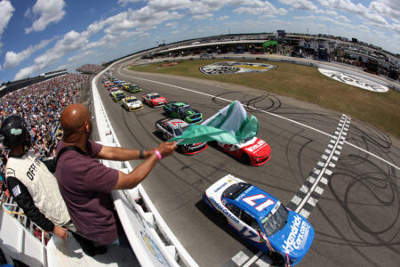 ROCKINGHAM, NORTH CAROLINA – APRIL 04: Corey Day, driver of the #17 HendrickCars.com Chevrolet, leads the field to the green flag to start the NASCAR O’Reilly Auto Parts Series North Carolina Education Lottery 250 Presented by Black’s Tire at Rockingham Speedway on April 04, 2026 in Rockingham, North Carolina. (Photo by James Gilbert/Getty Images)
