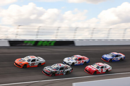 ROCKINGHAM, NORTH CAROLINA – APRIL 04: William Sawalich, driver of the #18 Soundgear Toyota, Justin Allgaier, driver of the #7 Jarrett Logistics Chevrolet, Brent Crews, driver of the #19 Mobil 1 Toyota, Jesse Love, driver of the #2 Whelen Chevrolet, and Rajah Caruth, driver of the #88 HendrickCars.com Chevrolet, race during the NASCAR O’Reilly Auto Parts Series North Carolina Education Lottery 250 Presented by Black’s Tire at Rockingham Speedway on April 04, 2026 in Rockingham, North Carolina. (Photo by Meg Oliphant/Getty Images)